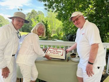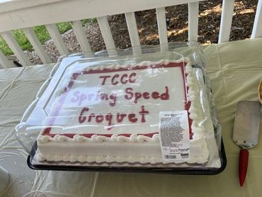 No timing necessary, just the speed and skill of getting your 1 ball through 4 wickets and then hit the stake. That’s all it took for the TCCC members to have fun on Sat. April 20 from 2-4pm. Don Olson, Linda and Norm Pike provided the snacks, a delicious sheet cake, and a game of challenges. 2 partners were given one color ball, either blue, red, black or yellow and a different corner to start at. When the whistle blew, all 4, 2 player teams each with their one color ball, scurried around the court. The players alternated hitting their ball through the 4 wickets to see which team color would hit the stake first. Weather was perfect, new friends formed, and a memorable day to enter the season of spring on the croquet lawn.